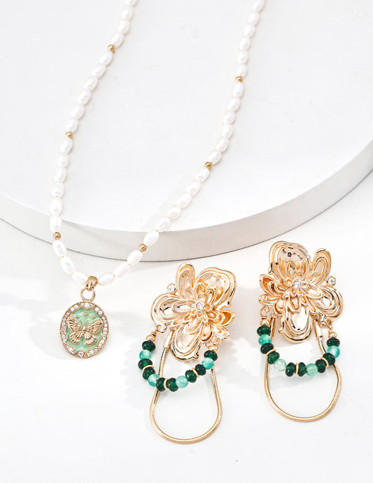 天然珍珠寶石頸鍊與手鍊 | S925純銀復古金色