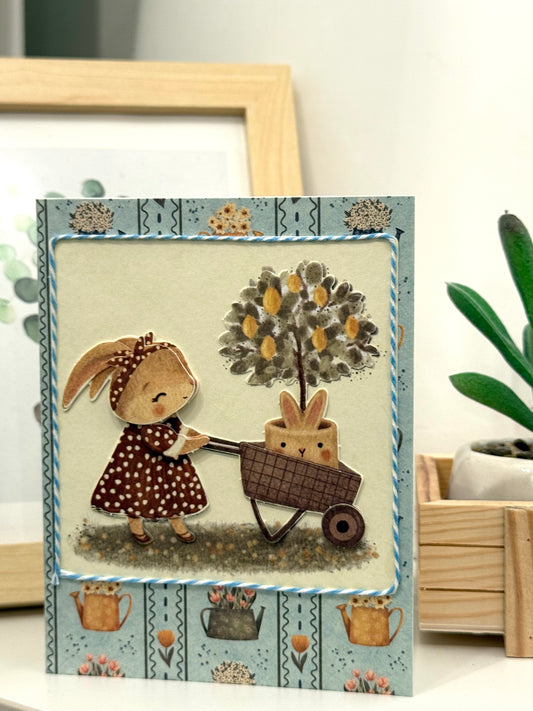 【手作心意卡】樹籬旁的小動物系列萬用卡 - 推着手推車的白兔小姐