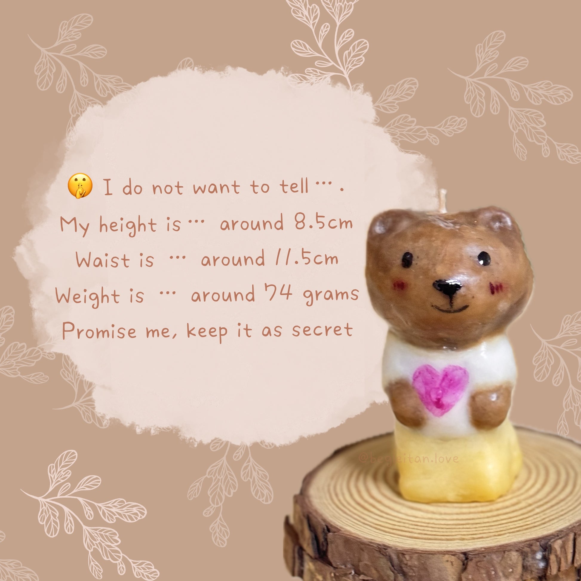 We make our candle one by one, without any molding. Every single candle is unique. Bear Olivia, a good friend of Rabbit Lucy. She is also the younger sister of tall bear Chocolate. Bear Olivia is frugal and typical Type I personality