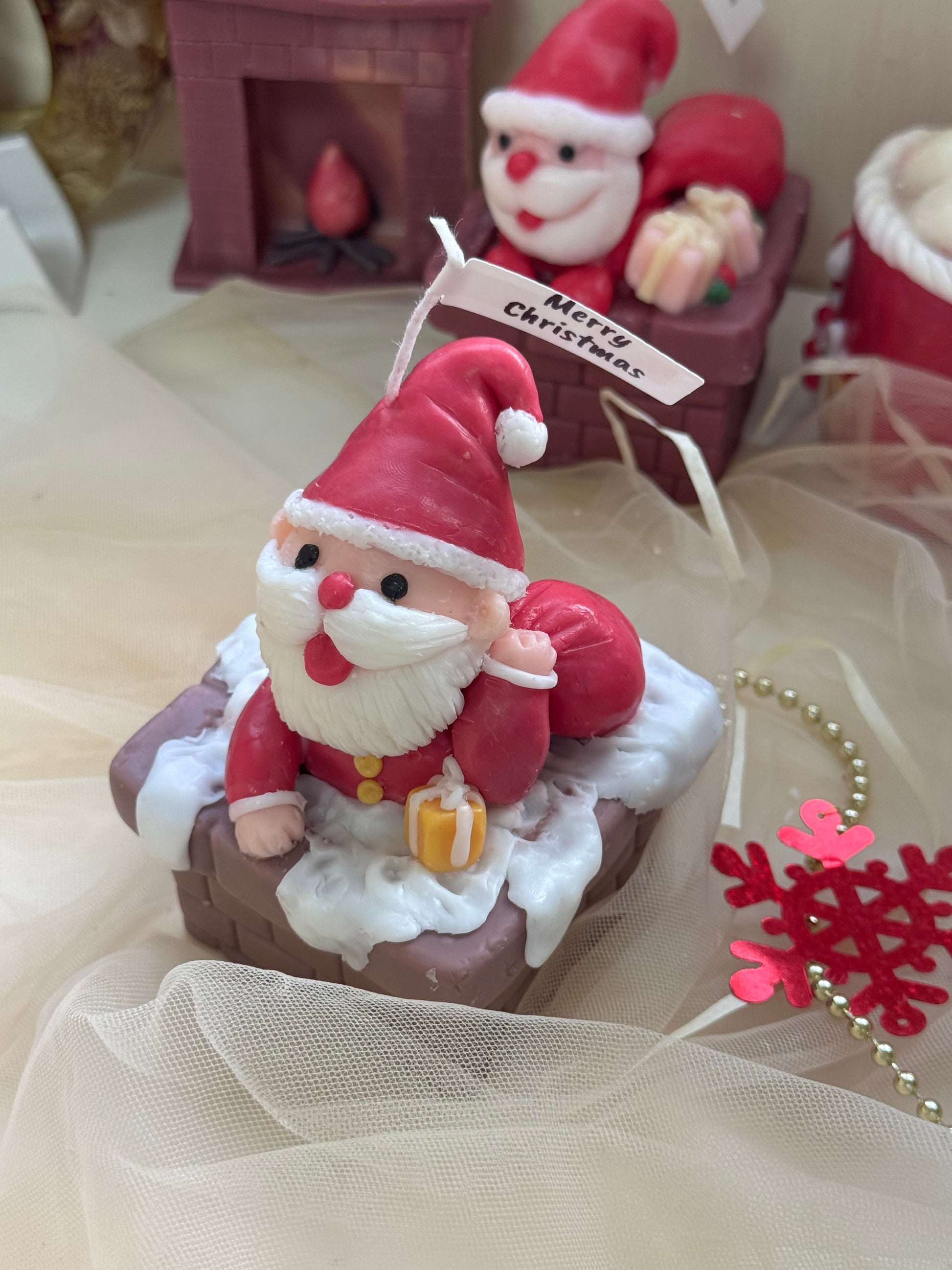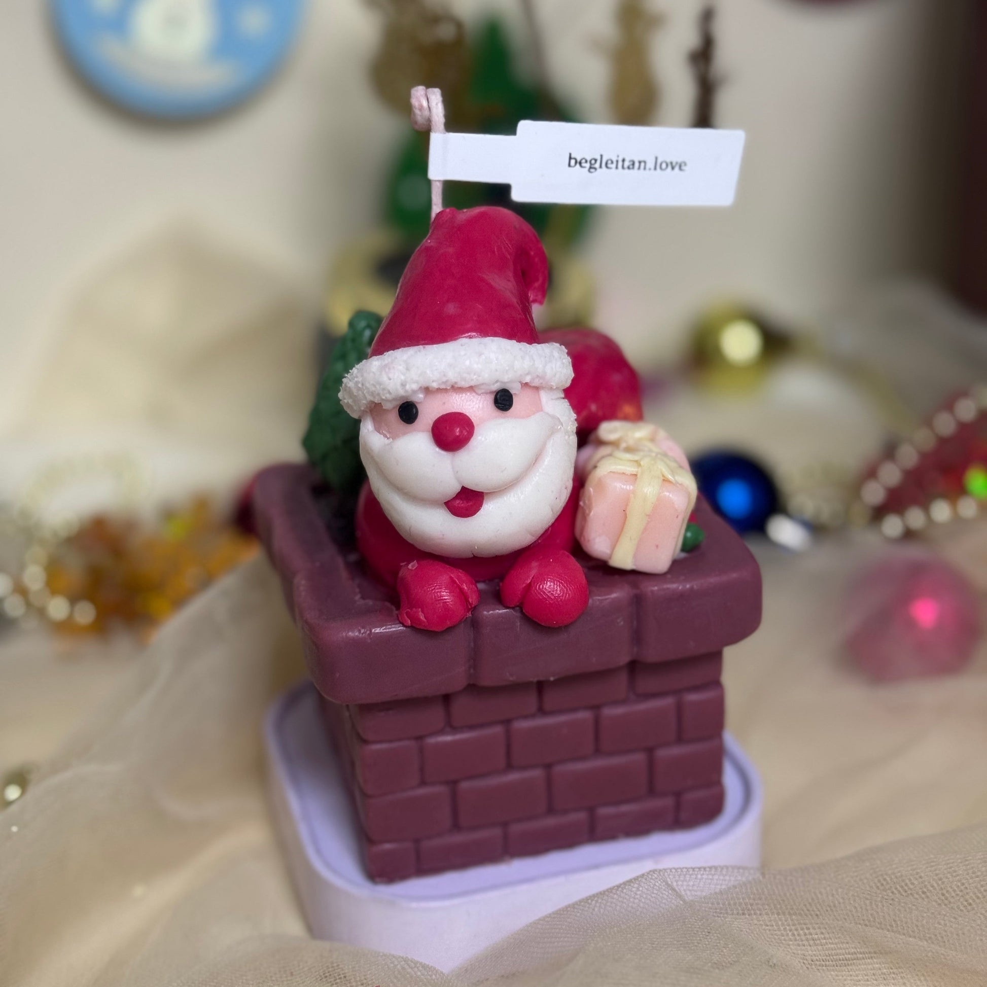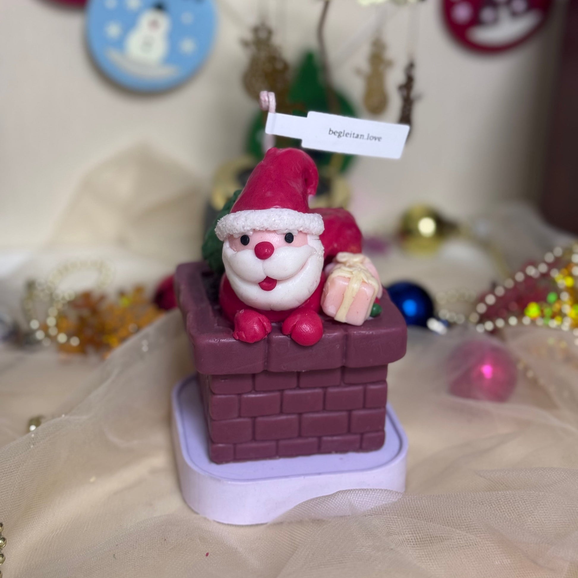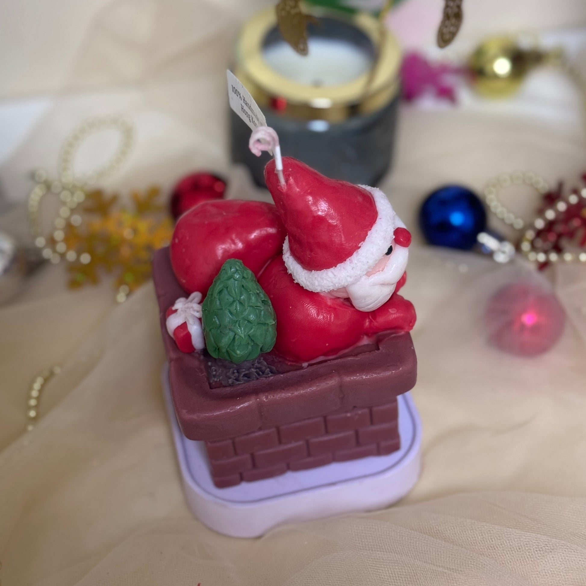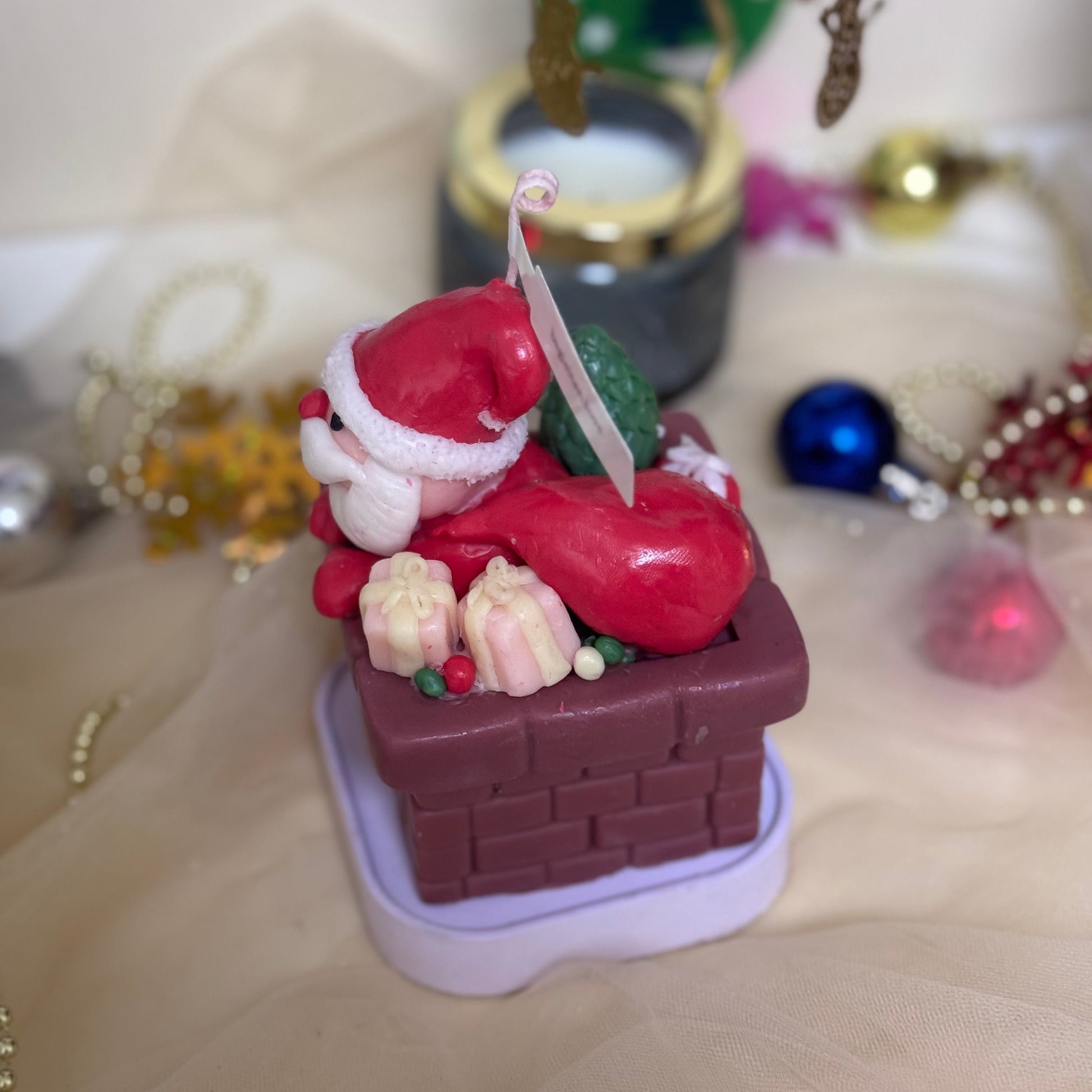 This charming handmade candle features Santa Claus emerging from a chimney, holding a bag of gifts. Perfect for the holiday season, it adds a touch of festive spirit to any room. Crafted with attention to detail, this delightful candle is an ideal gift or decorative piece for Christmas celebrations.