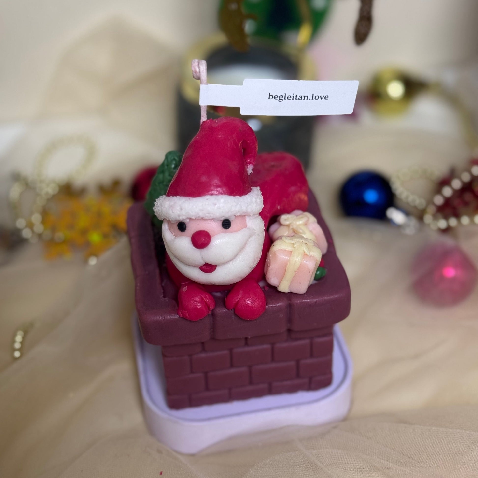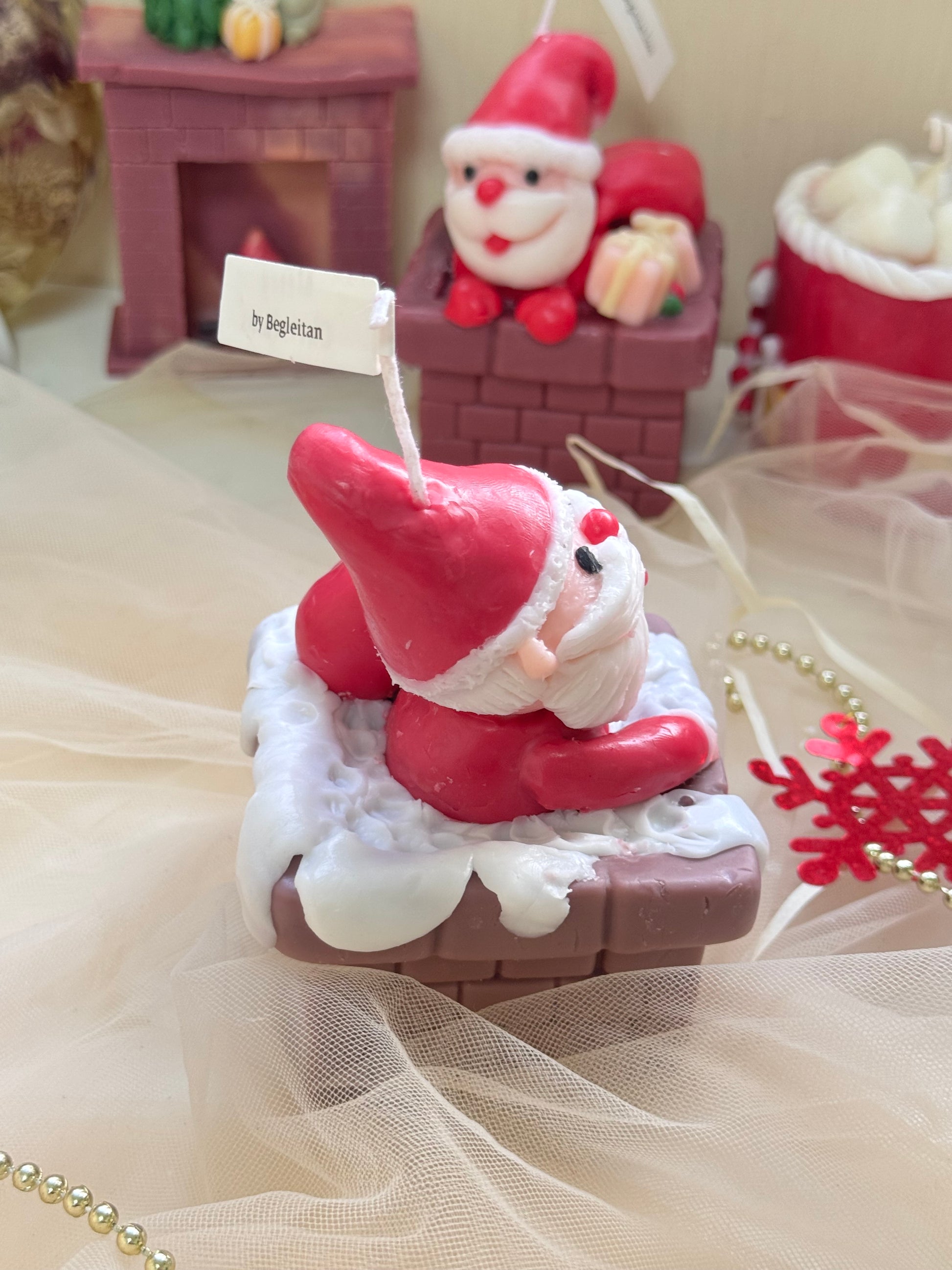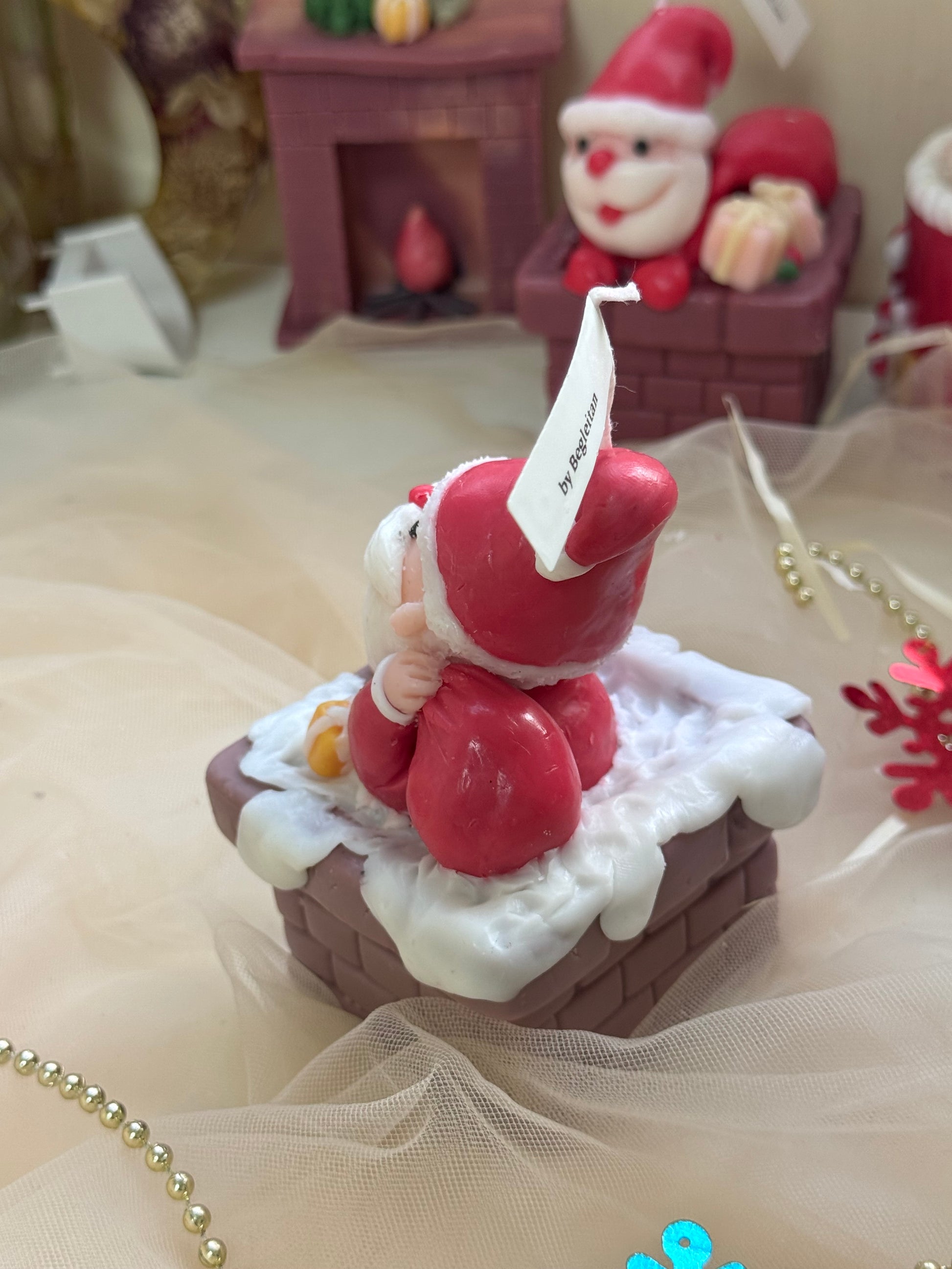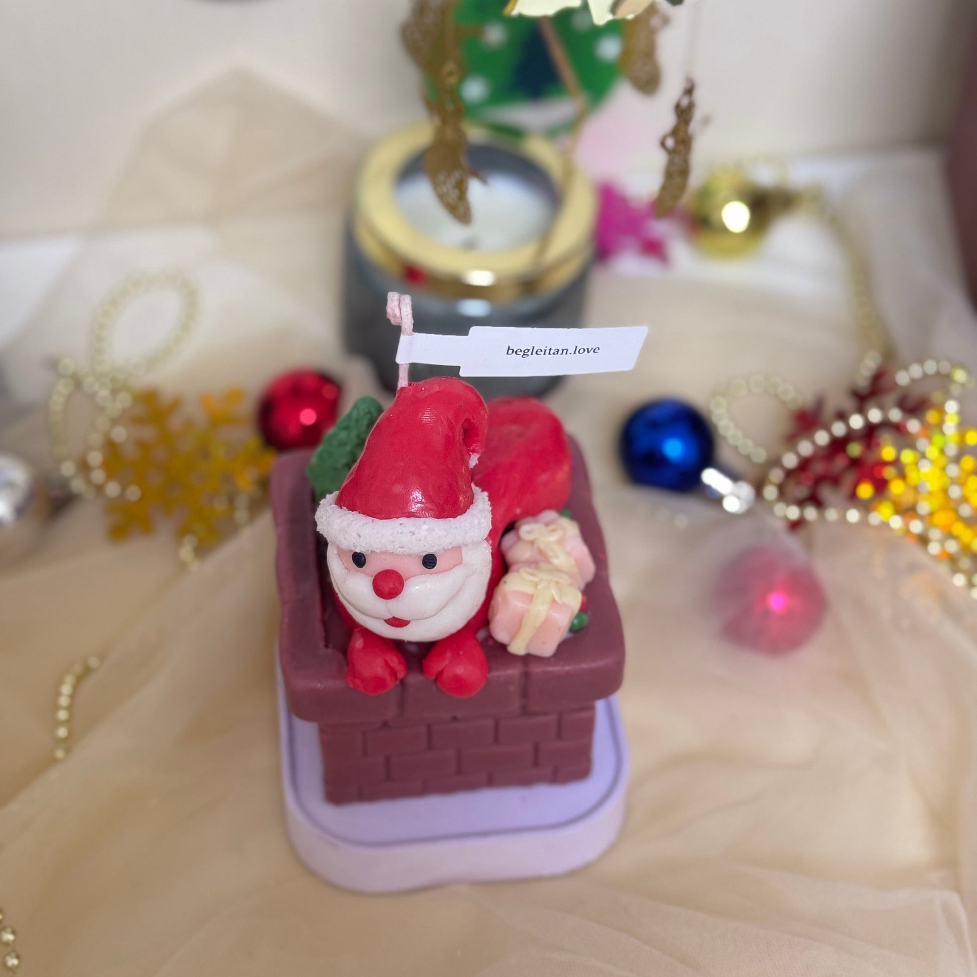 This charming handmade candle features Santa Claus emerging from a chimney, holding a bag of gifts. Perfect for the holiday season, it adds a touch of festive spirit to any room. Crafted with attention to detail, this delightful candle is an ideal gift or decorative piece for Christmas celebrations.