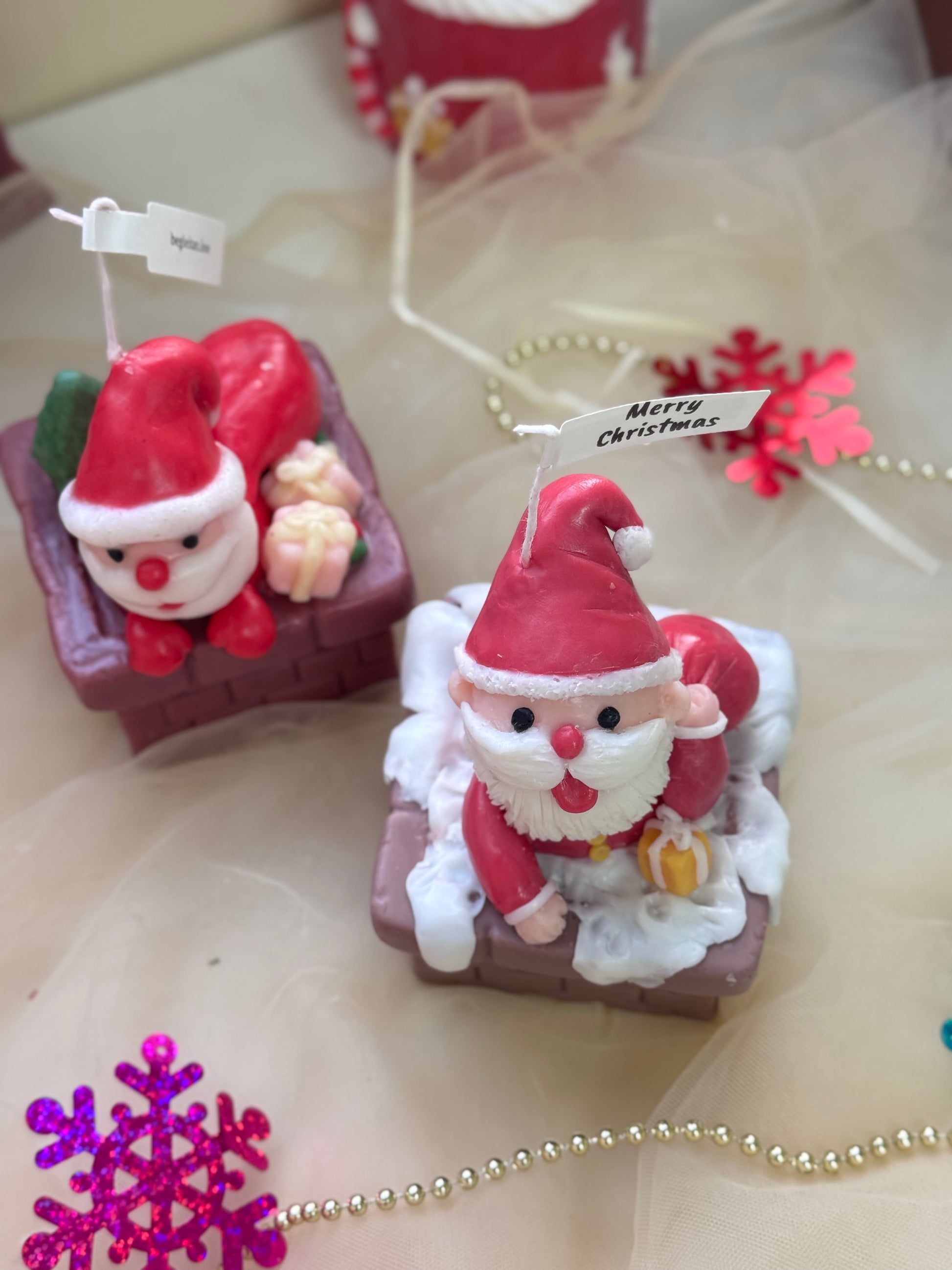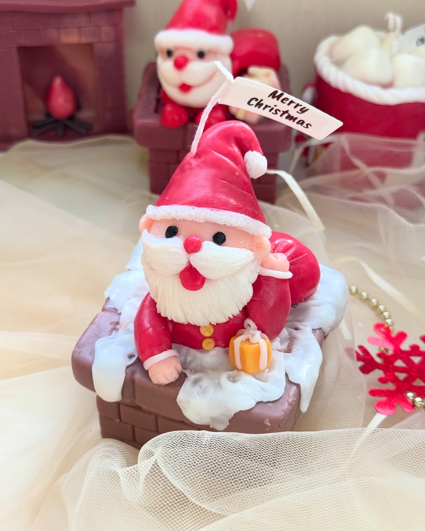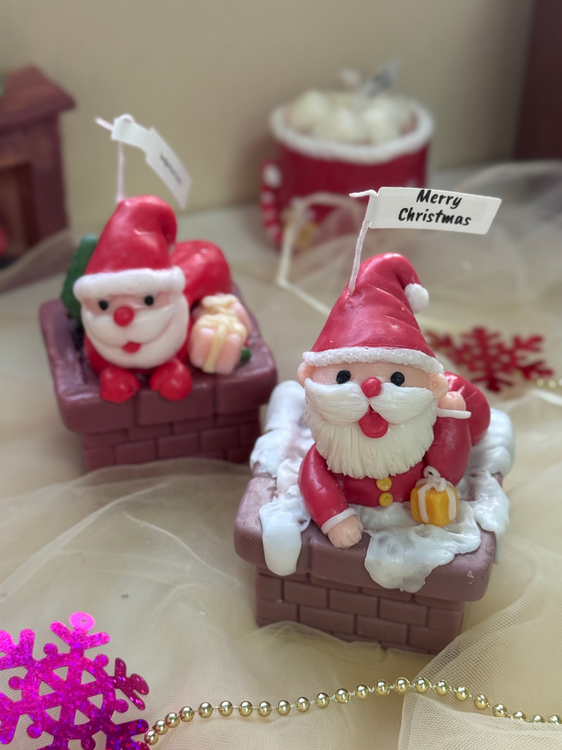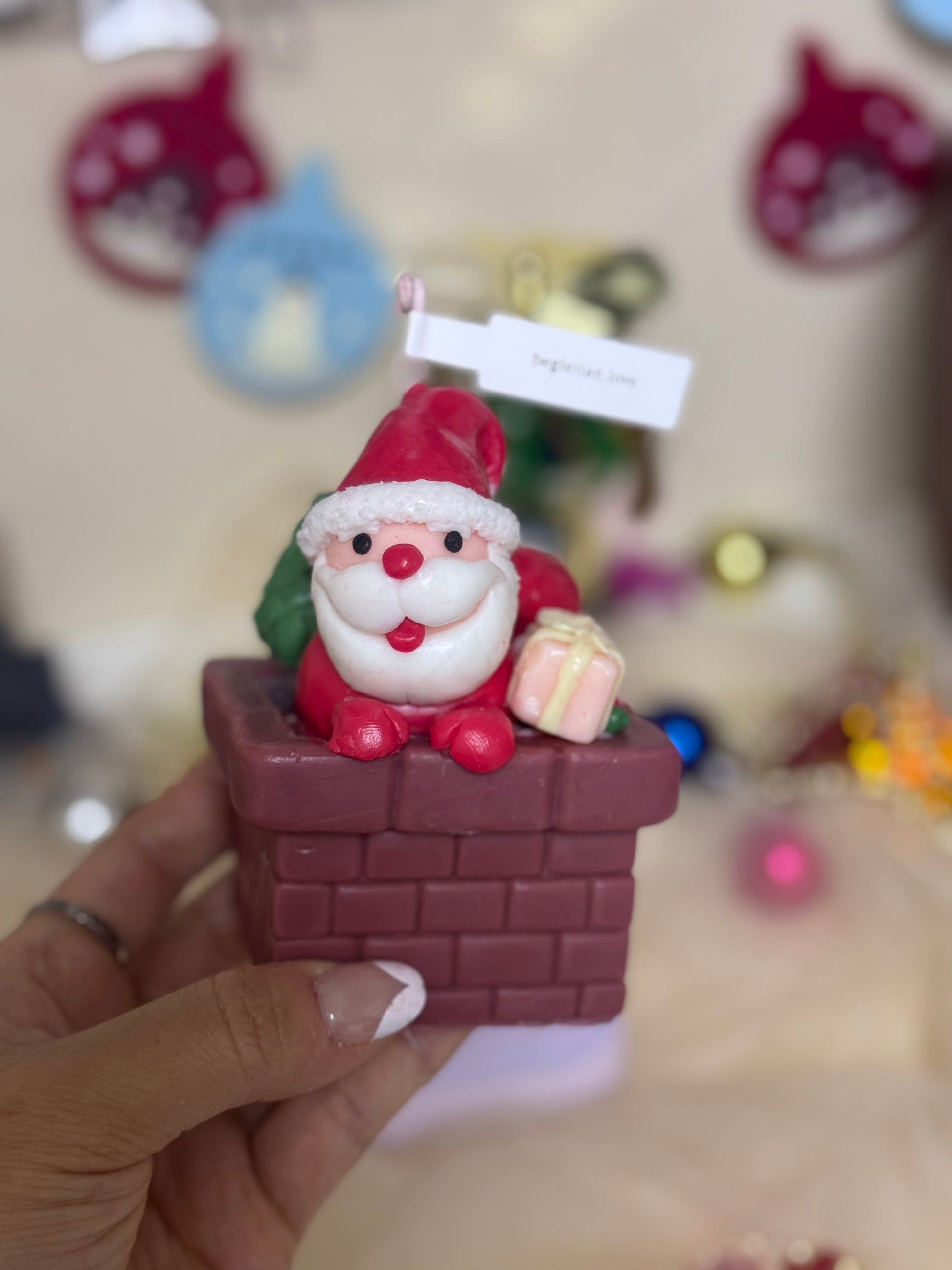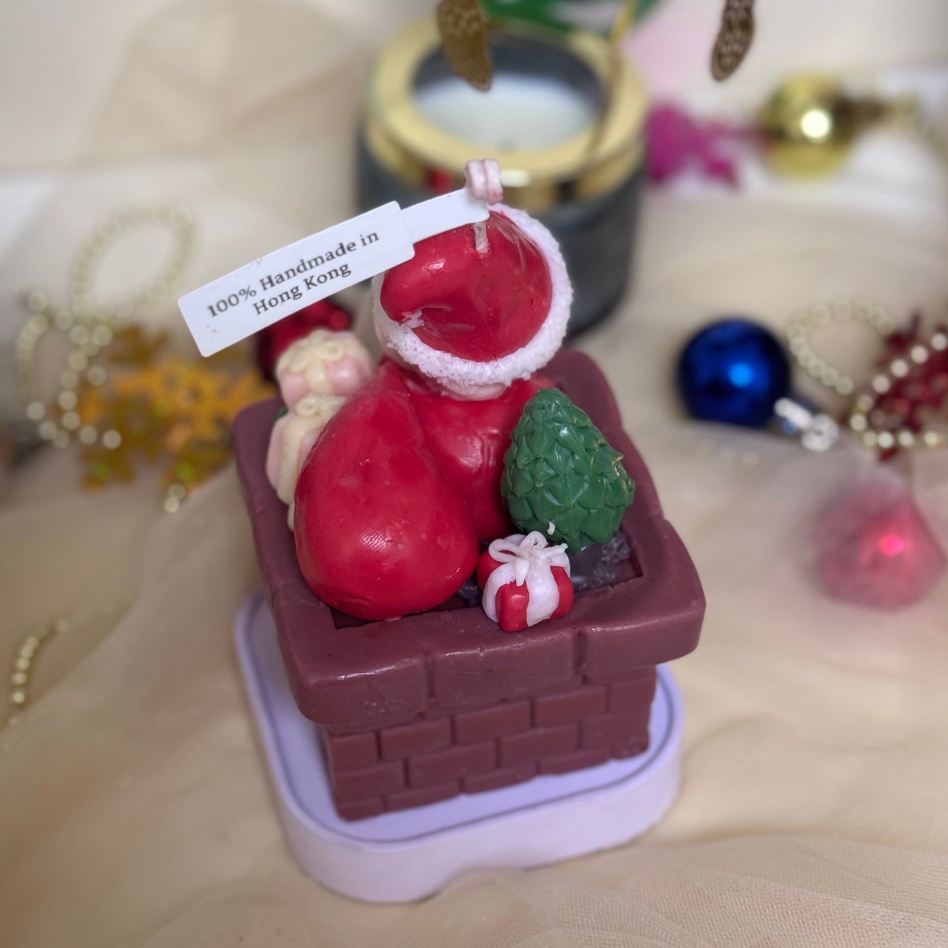 This charming handmade candle features Santa Claus emerging from a chimney, holding a bag of gifts. Perfect for the holiday season, it adds a touch of festive spirit to any room. Crafted with attention to detail, this delightful candle is an ideal gift or decorative piece for Christmas celebrations.