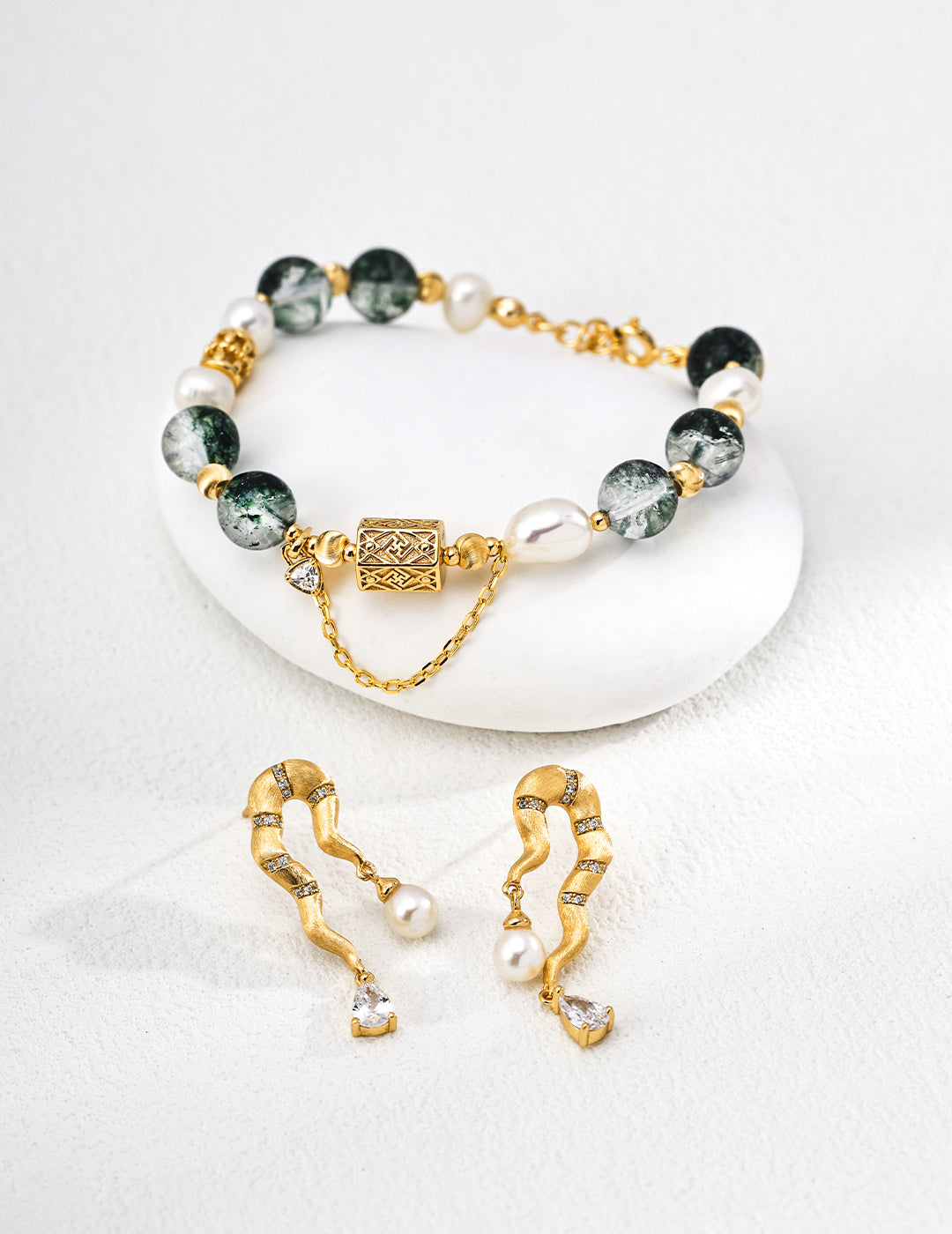 Inspired by the tranquil beauty of West Lake, the Mooli “Willow Whisper” Bracelet evokes the gentle sway of willows and the serene shimmer of water. This delicate piece features a harmonious Natural Green Phantom Crystal & Natural Pearl, accented with gold and crafted from 925 sterling silver, natural stones, synthetic gems, and glass. With a soft 16cm chain and a 3cm extension, it’s designed to float gracefully on your wrist—perfect for summer days and poetic souls.