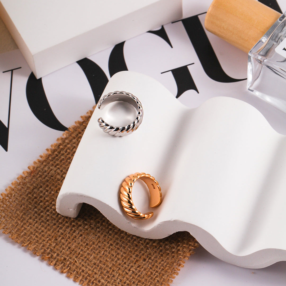 以齒輪紋理為靈感,S925純銀打造,微微傾斜的凹凸紋路展現獨特設計感。象徵力量、精準與個性。提供金色與銀色款式,開口設計可自由調節,佩戴舒適靈活,是現代風格的亮點首飾。
