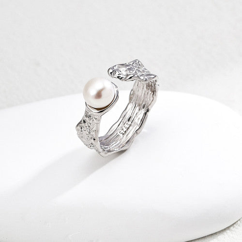 天然珍珠錘紋純銀戒指