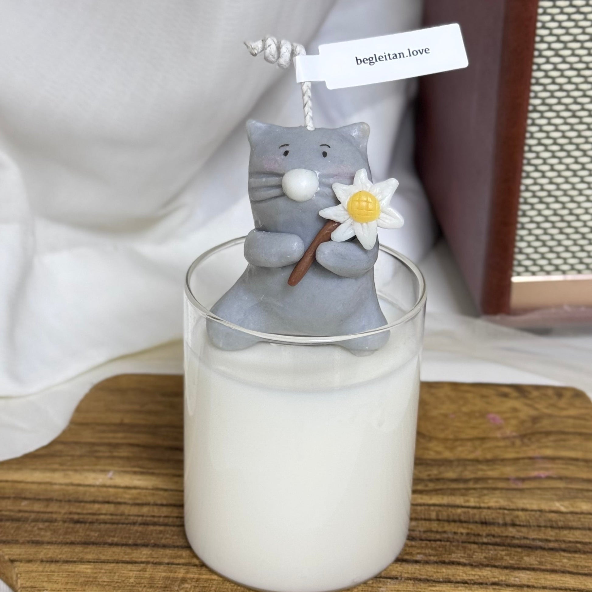 這是一支拿著花的貓形蠟燭。其異想天開的設計,加上迷人的面部表情和姿態,使其成為可愛且跳皮的裝飾品。