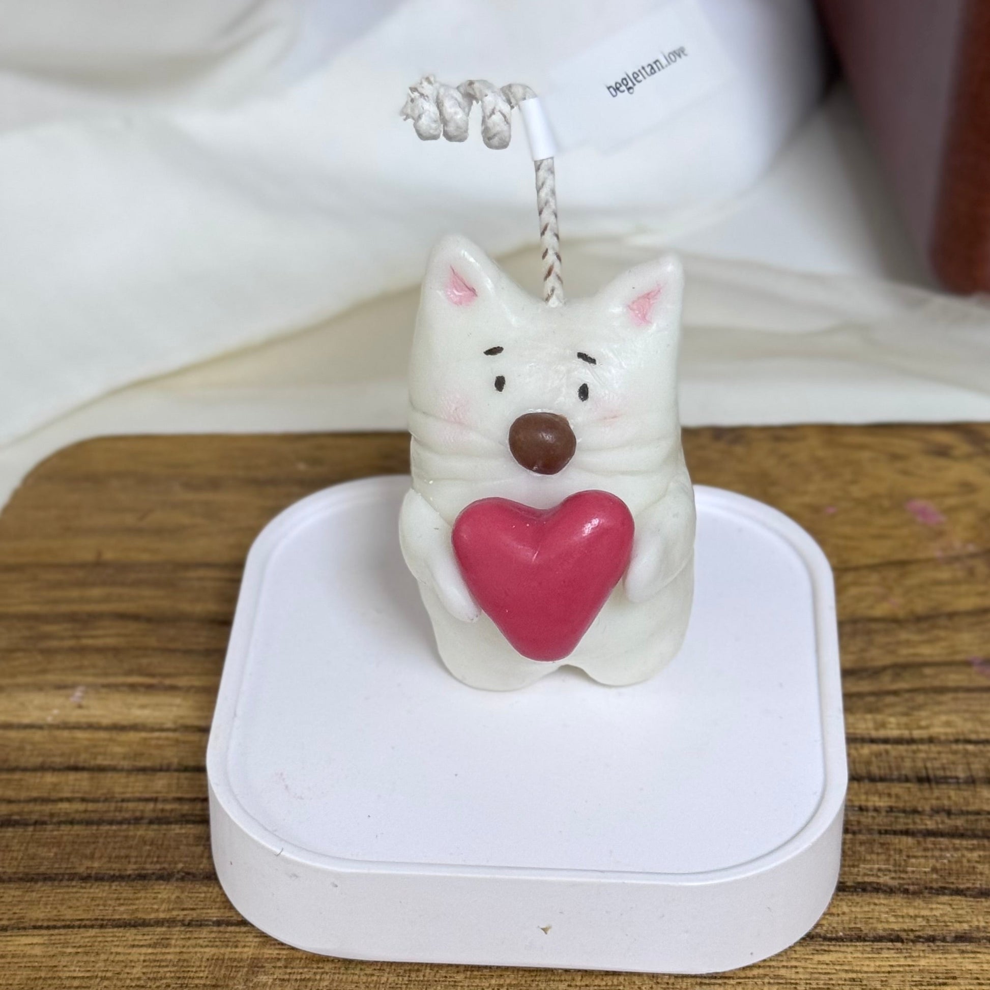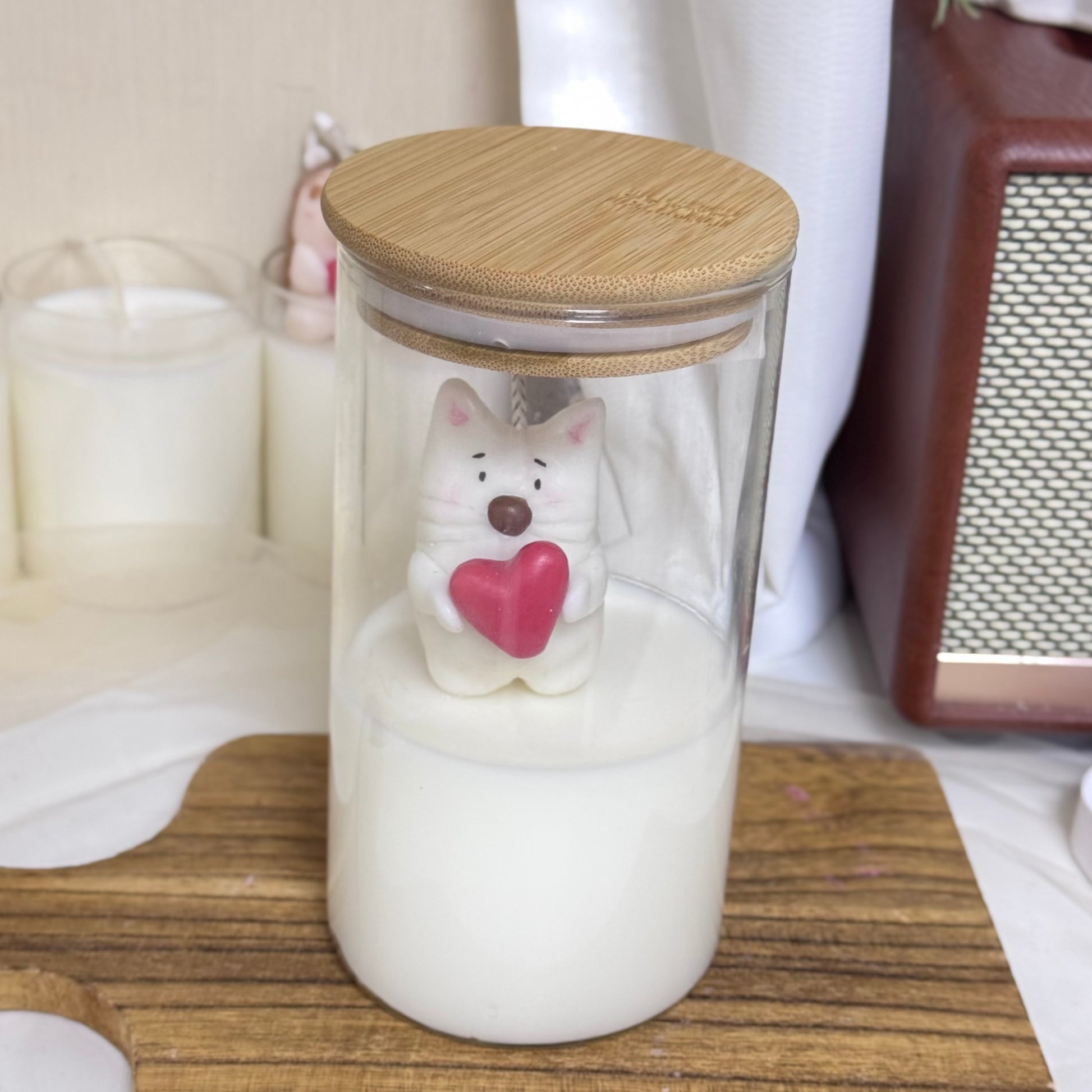 這是一支可愛小貓托著一顆心的形狀蠟燭,並置放在玻璃杯中,可愛且實用的造型非常適合用作裝飾或作為送禮的禮物。