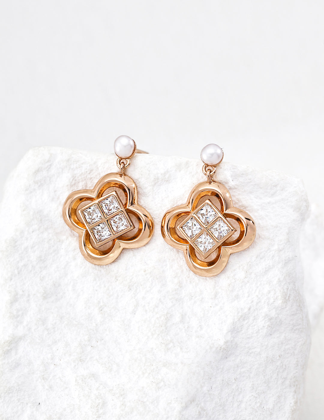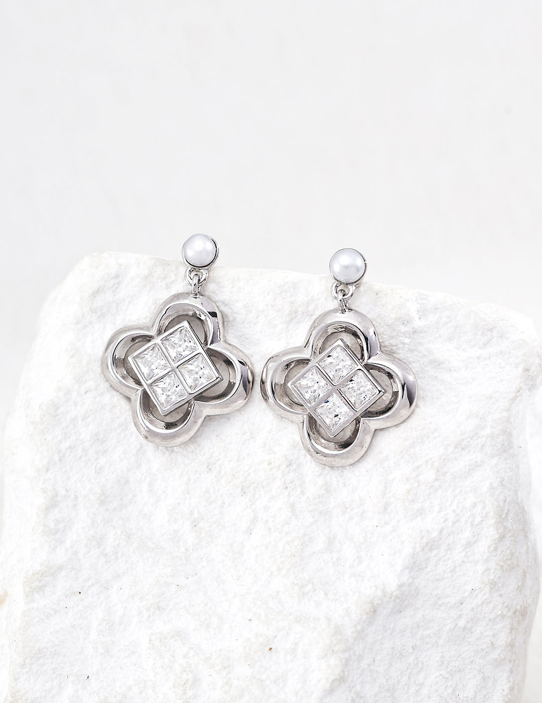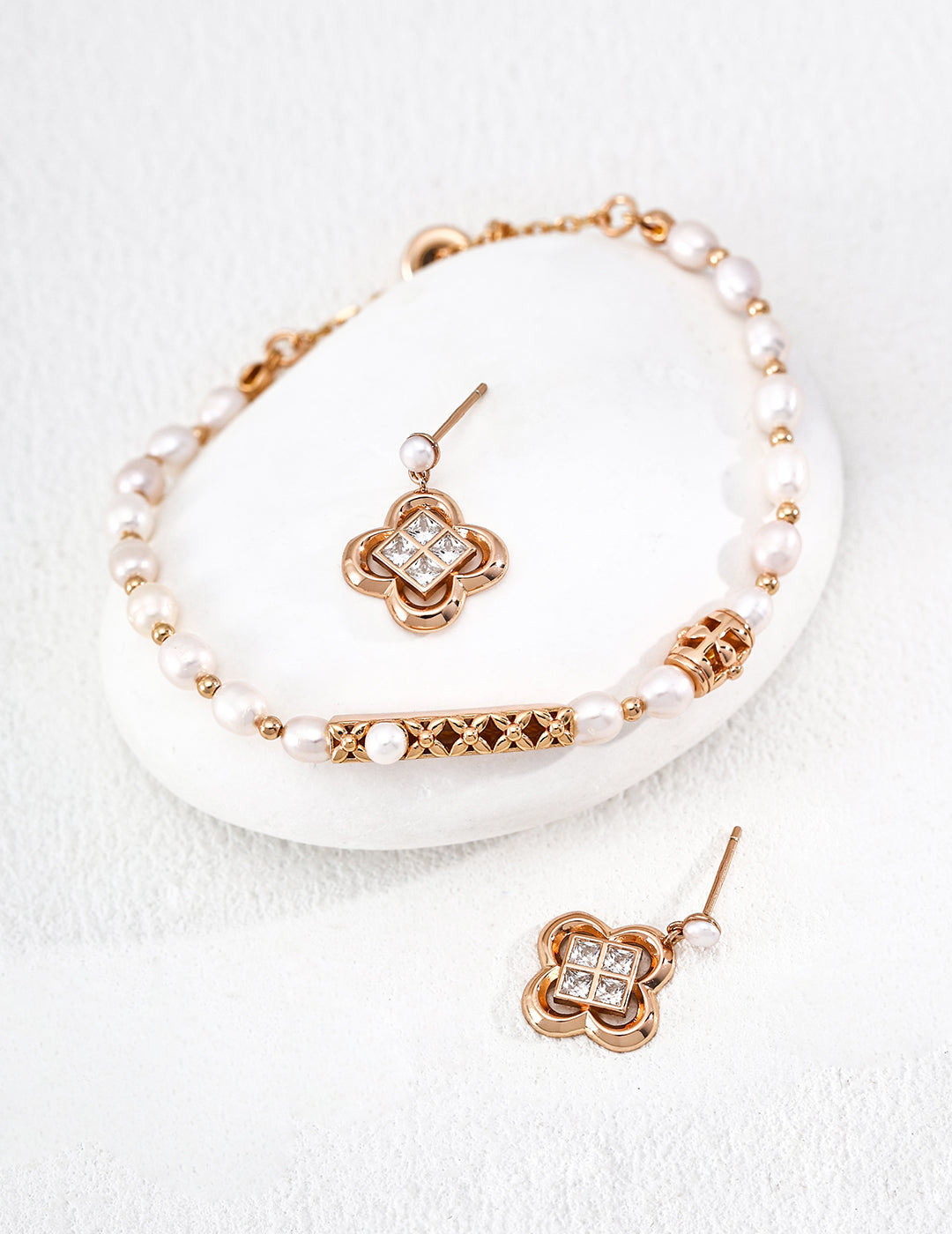 以【幸運四葉草飾品系列】為造型增添幸運與光彩。純銀耳環與可調式手鍊,四葉草輪廓鑲嵌閃耀水晶,搭配珍珠耳釘,低調卻精緻。日常佩戴或拍照皆能展現氛圍感。提供銀色與玫瑰金色選擇。