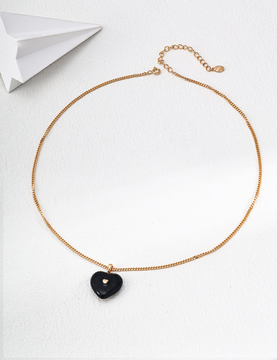 • 項鍊 – 40 公分鍊子 + 6 公分延長鏈,心型吊墜,金色輪廓,黑色琺瑯中心