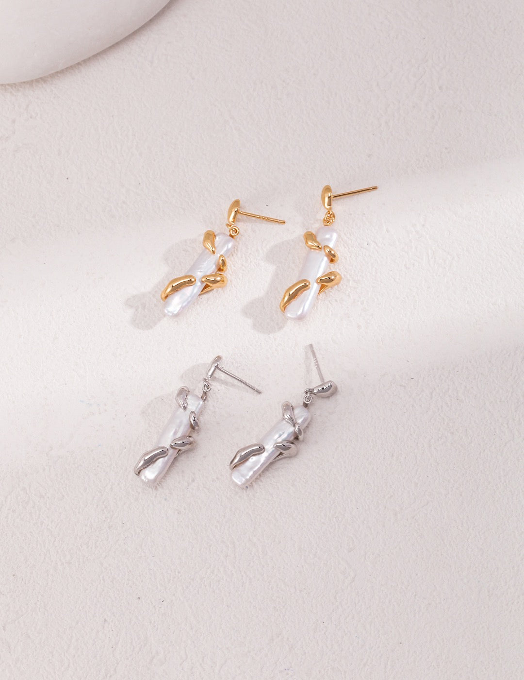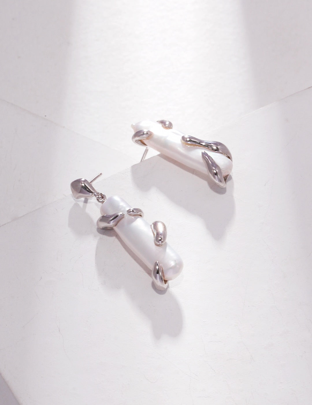 這些耳環的靈感源自自然元素,其核心採用天然巴洛克珍珠,周圍環繞著流暢的銀色設計。珠光和銀色光澤的融合營造出既浪漫又獨特的外觀。