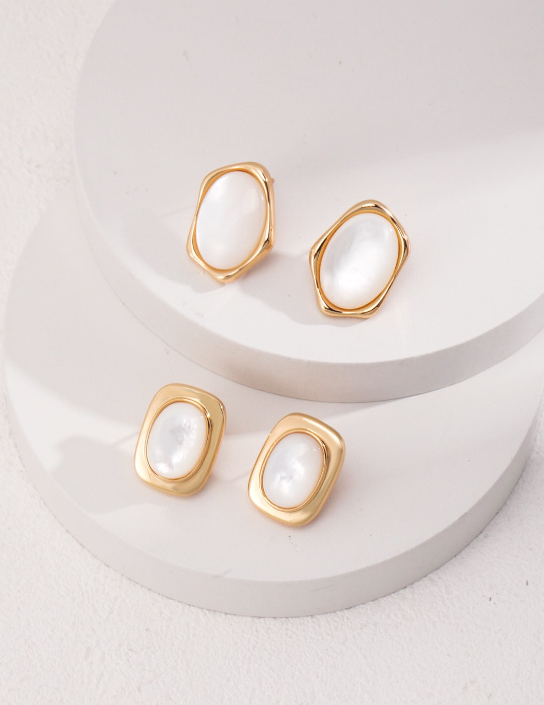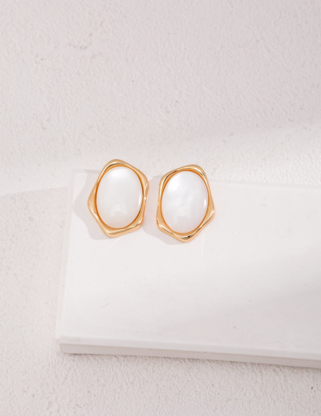 復古金色橢圓形耳環 – 925 銀和珍珠母貝
